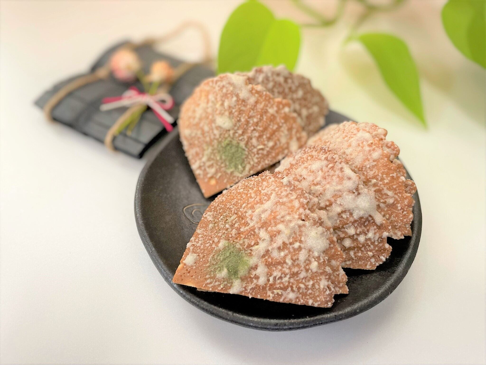 扇形にカットしたお煎餅に、香り高い生姜砂糖とアオサを振りかけました。